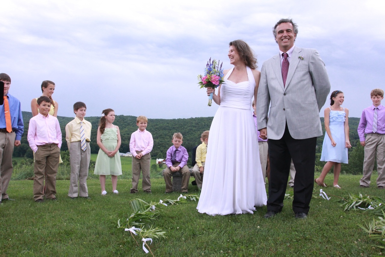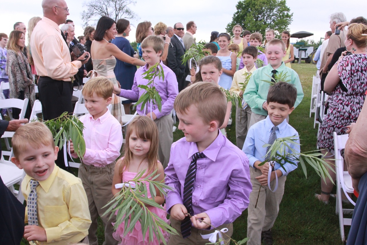 It was just about time for the ceremony to begin, when dark clouds, thunder and lighting rolled across the expansive skies at Alyson’s Orchard. We waited for the storm to blow over. The friendly staff dried off the chairs. The wagon delivered the bride and groom and their 20 beautiful and handsome nieces and nephews to the ceremony sight. In their pastel clothes the children processed down the aisle with willow branches and formed a circle of love in which the bride and groom made their vows.