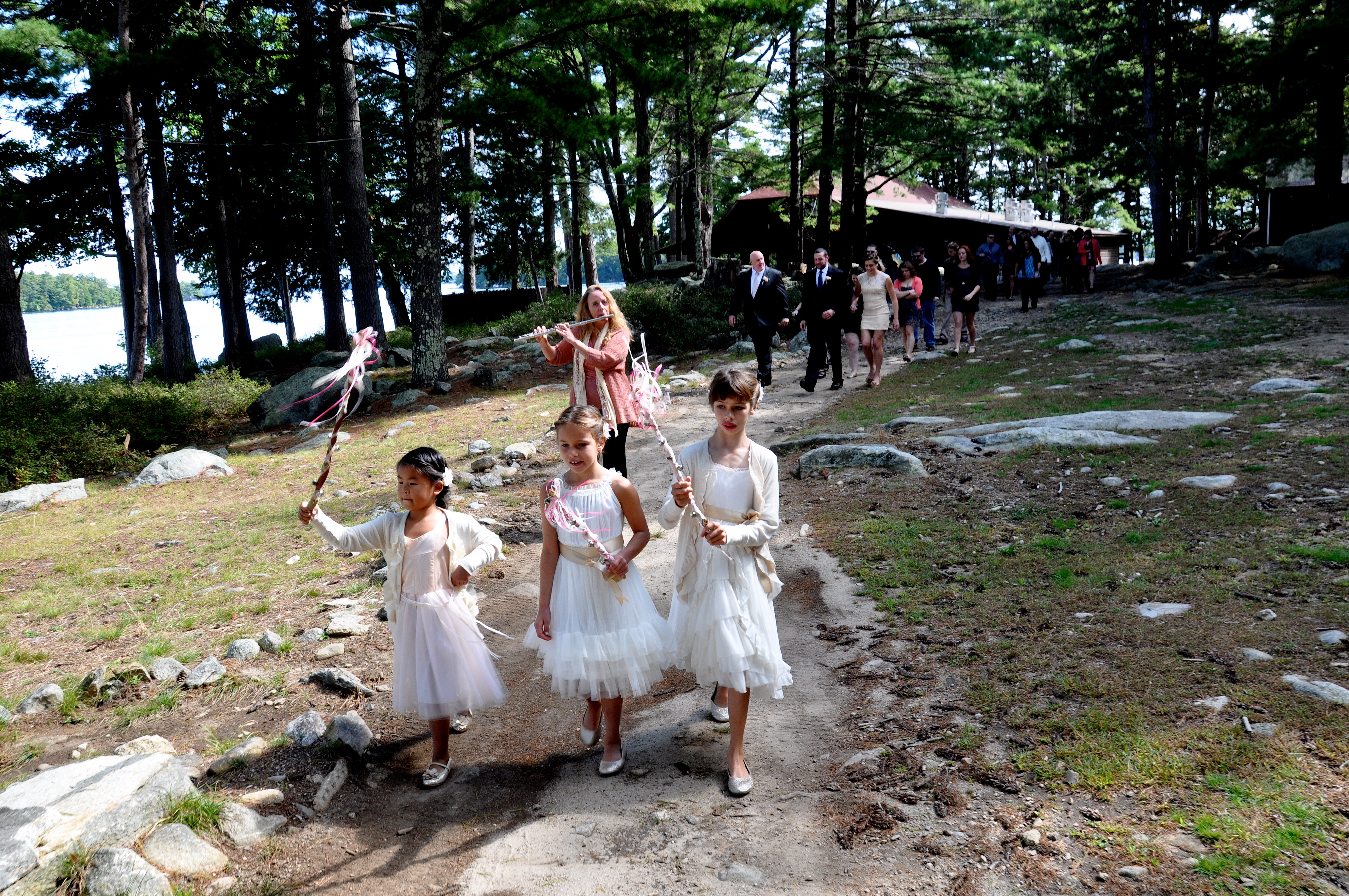 For Kelly and Mark who first met in London, then lived for a time in Australia and got married on an island in Lake Winnipesaukee, I proposed a parade of the guests (a tradition found in various parts of the world) from the boat dock to the ceremonial site. Three eager flower girls led the way while I played two tunes from the British Isles on flute: Haste to the Wedding & Marie’s Wedding.